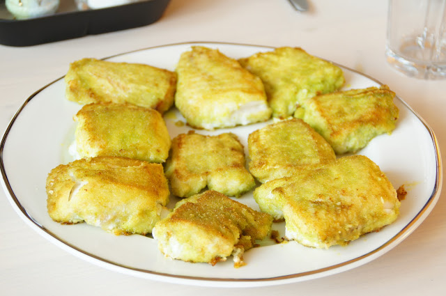 Lange-filet med krydderurterasp - 1/2 bundt persille, 1 bundt dild og rasp blendet sammen, hvorefter fiske blev vendt i det og stegt på panden i halv olie halv smør.