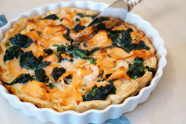 I dag havde junior og jeg besøg af min mor og søster. Det var superhyggeligt, og tiden fløj afsted :o) Både min søster og jeg er ved at forsøge at smide lidt kilo, så derfor tænkte jeg, at jeg hellere måtte forsøge at lave noget forholdsvist sundt til frokost (altså det var ikke kun sunde sager, for vi fik en gulerodscupcake med CCF til kaffen ;o), derfor stod menuen på en tærte med røget laks og spinat, efter en opskrift fundet hos Kræftens Bekæmpelse, dog med enkle ændringer - jeg havde nemlig tærtedej i fryseren, så jeg droppede at lave den selv, så derfor skriver jeg den, som jeg lavede den. Men det var en virkelig lækker tærte, som jeg sagtens kunne finde på at lave en anden gang.